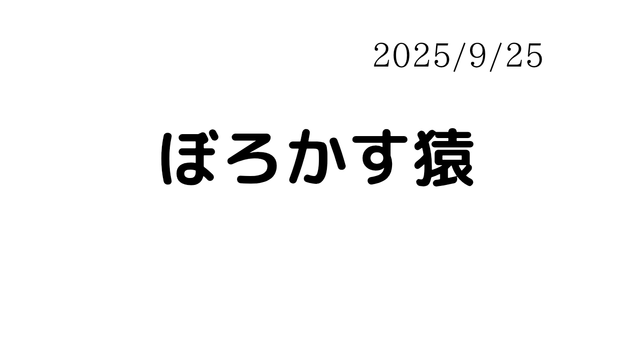 ぼろかす猿 雑記 X Facebook はてブ Pocket LINE コピー 2025.09.25 今日もぼろかすにやられました。 マイキー雑魚い。 タケミッチーも弱い くずすぎるゼ★ カレーも食べてガンギマリ。 やってらんないゼ★ おなかも痛いし なんなんだらゃあ!!!