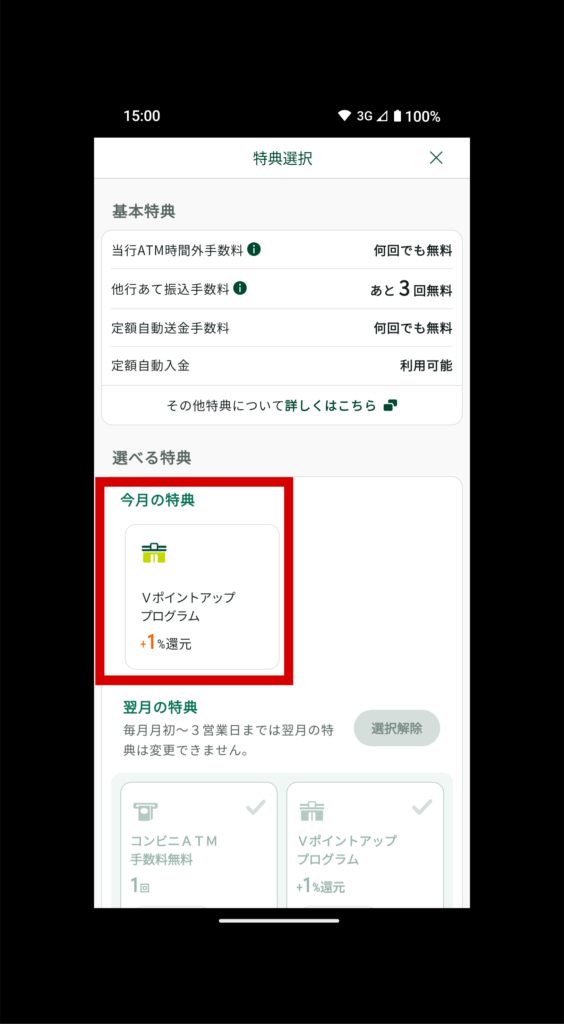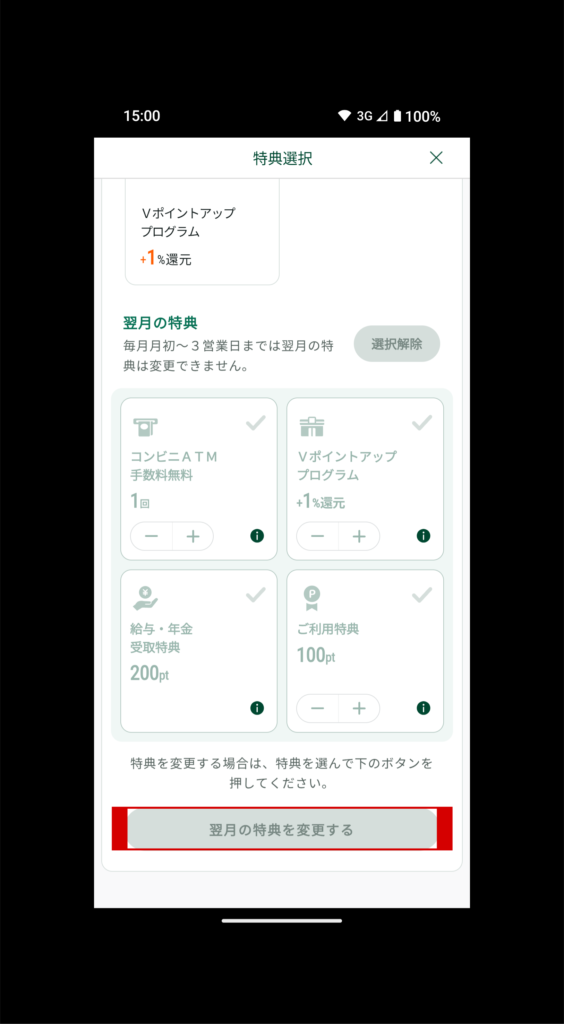 翌月の特典を選択するには、コンビニATM手数料無料1回、Vポイントアッププログラム+1%、給与・年金受取特典200ポイント、ご利用特典100ポイントの中から選択し、「翌月の特典を変更する」(赤枠)をタップすれば、翌月の特典の変更が完了します。