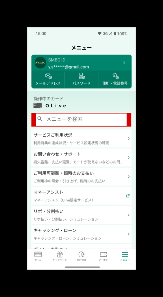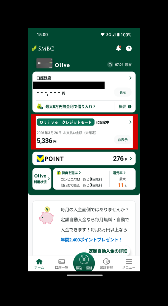 SMBCアプリを開き、最初の画面の赤枠内が現在セットされている支払いモードになります。