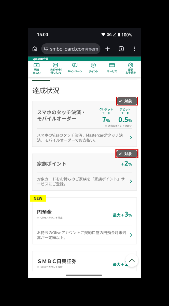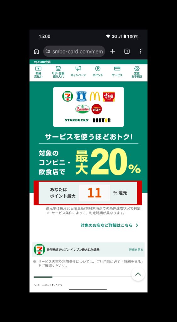 還元率(赤枠)をタッチすれば現在の還元率が大きく表示され、その下には還元項目の達成状況が表示されます。