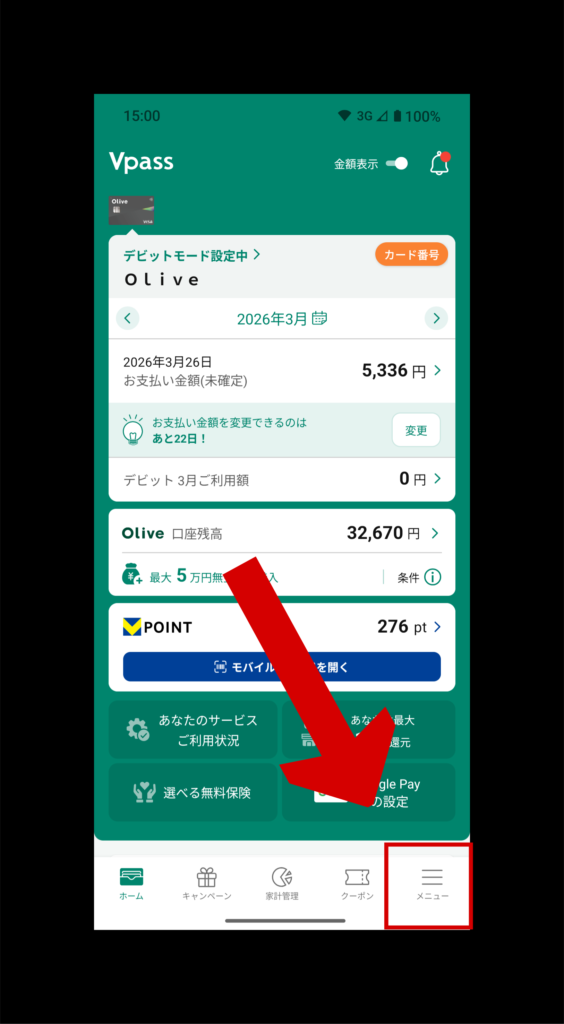 Vpassアプリにログインして右下のメニューをクリック(赤枠)します。