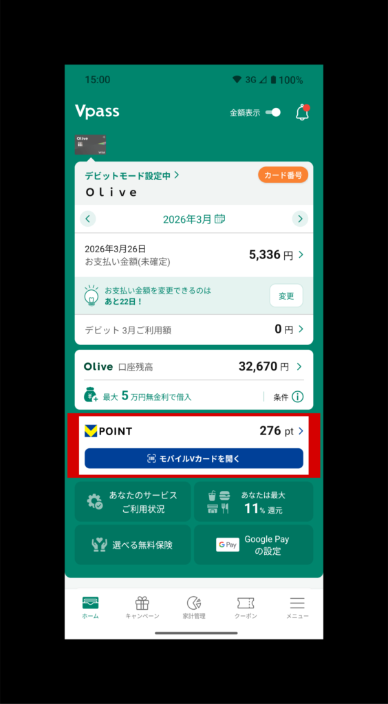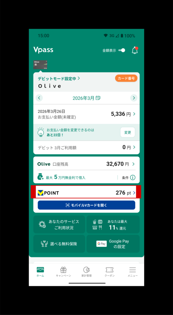 Vpassアプリを開き、ポイント(赤枠)をタップ