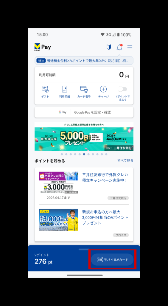 VポイントPayアプリを開き、右下に出てくるモバイルVカード(赤枠)をクリック