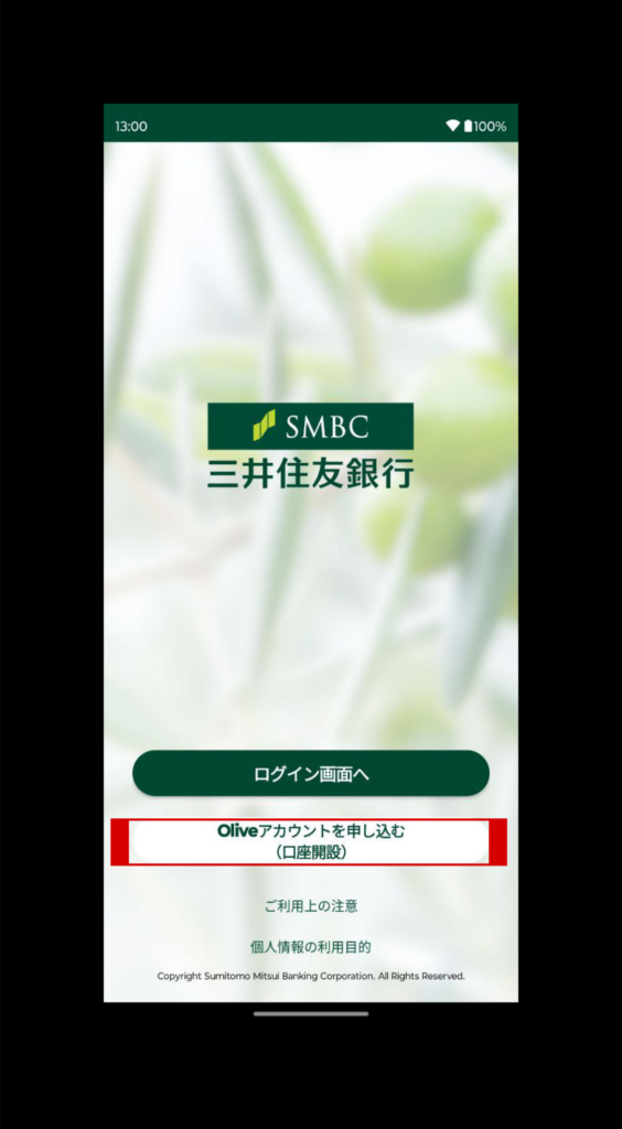 アプリダウンロード後、Oliveアカウントを申し込む(赤枠)をクリックします。