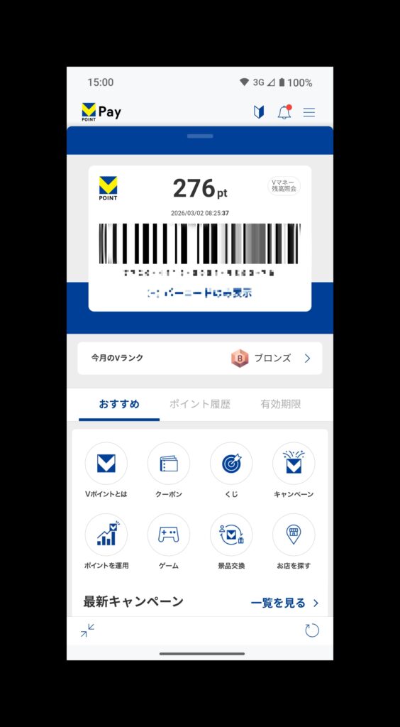 VポイントPayアプリでポイントをチャージしておけば、バーコード決済も可能になります。