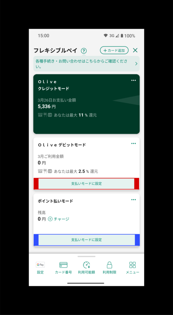 画面が切り替わり、設定中のクレジット支払いモードは緑色になっています。