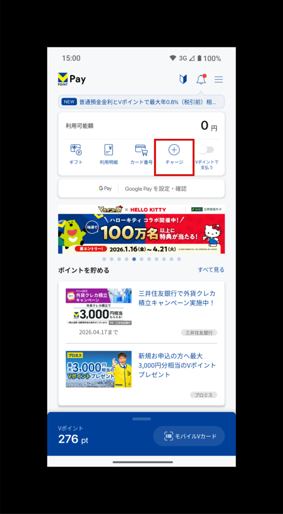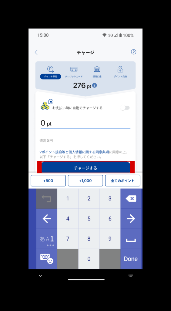 VポイントPayアプリを開き、チャージ(赤枠)をクリックし、ポイントをいくらチャージするのかを設定します。