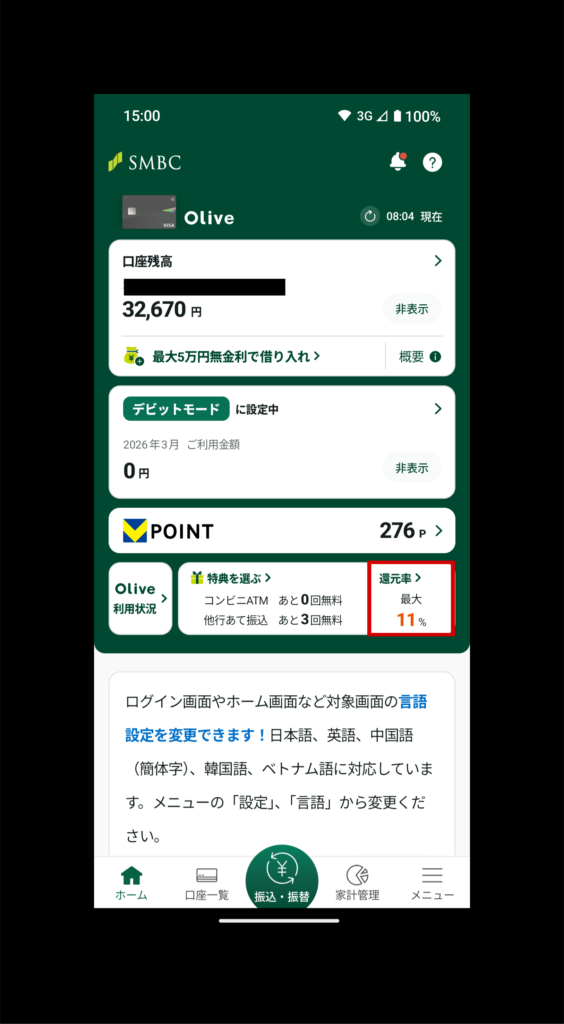 SMBCアプリにログインし、還元率(赤枠)で確認できます。