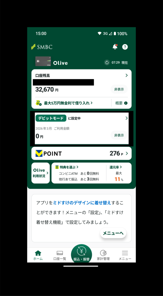 赤枠のデビット払いをクリックし、SMBCアプリの最初の画面に戻ると、設定中の支払いモードがクレジット払いから、デビット払いに変わっています(黒枠)。