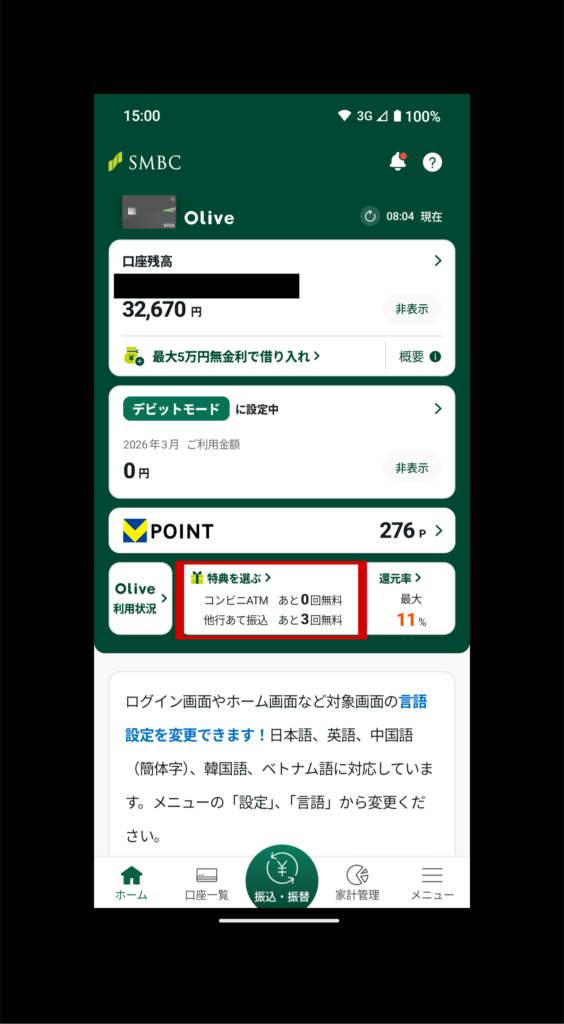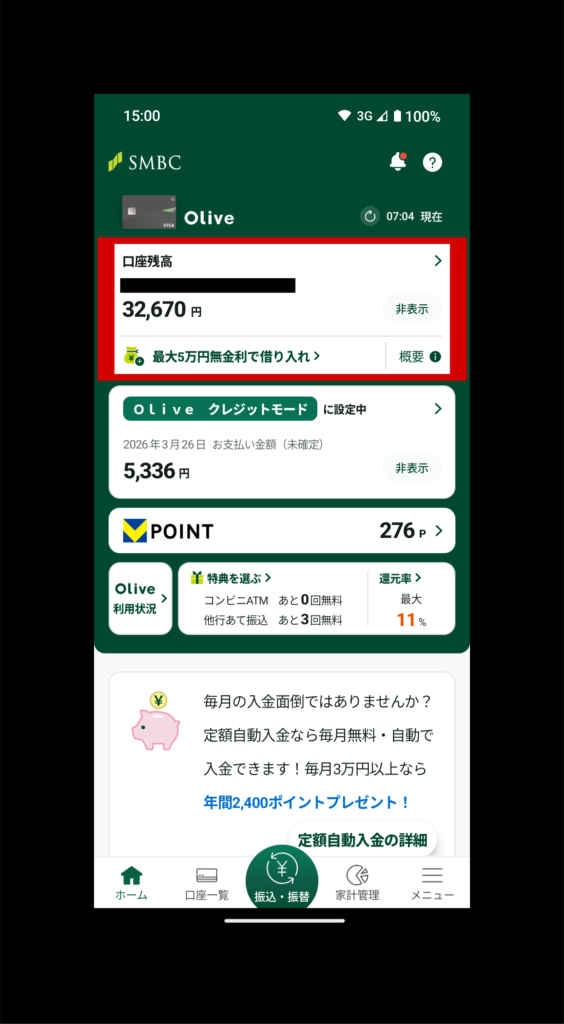 三井住友銀行アプリにログインして、口座の残高はこちらで確認できます(赤枠)。