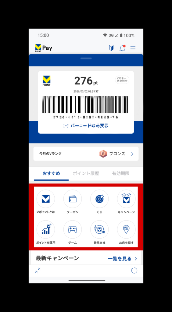 また、バーコード表示画面のバーコード下(赤枠)からは、クーポンを探せたり、ポイントが貯まるゲームやくじ、ポイントの運用や、貯まったポイントから景品交換ができます。