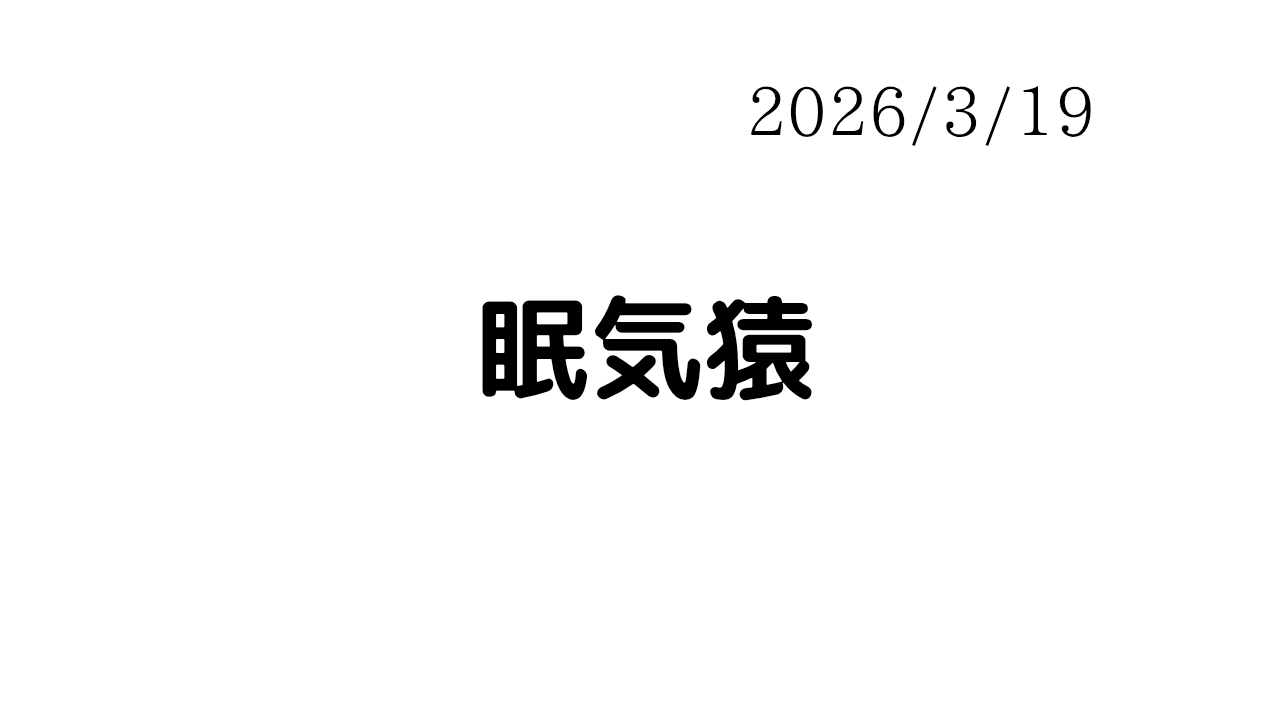 眠気猿 雑記 X Facebook はてブ Pocket LINE コピー 2026.03.19 今日も眠気と戦っています。 ぼけーとしながら、仕事しています。 眠気が酷いときは、早くから店舗で働いています。笑 細かい運は悪い、悪すぎるけど 悪運は強いと自負しております。 俺も部屋でゴロゴロしたひなはあ